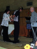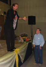 Für die musikalische Unterhaltung an diesem Abend war Dieter Leidner engagiert worden, der in kürzester Zeit eine tolle Stimmung in der Halle verbreitete und so manches Paar zu tanzen animierte. Überraschungsgast des Abends war der Zauberkünstler und Animateur „Kalibo“ der mit seinem Programm „Mit Schirm, Charme und Zitrone“ nach dem gemeinsamen Abendessen das Publikum begeisterte. Verblüffend war für alle, wie er aus einem aus dem Publikum bereitgestellten Herrensakko „Tafelsilber“ rieseln, oder sich von einem Publikumspaar rücklings fesseln lies und sich dann hinter einer vorgehaltenen Jacke innerhalb kürzester Zeit seiner Fesseln entledigte und dabei - zur absoluten Überraschung aller - das Publikumspaar aneinander gefesselt hatte.