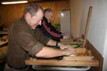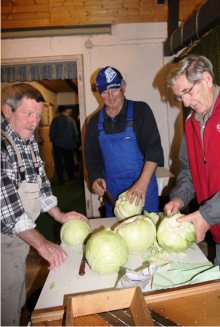 ![]() | Sauerkraut ist eingetopft Es ist schon ein vertrautes Treffen. Im vierten Jahr in Folge hatten sich am Samstag, den 06.11.10 Vereinsmitglieder und Zuschauer im Uchtelfanger Kelterhaus zum Sauerkraut-Einmachtag eingefunden. Die meisten Teilnehmer haben sich mittlerweile einen Gärtopf gekauft, weil Sie die Erfahrung gemacht haben, dass das selbst hergestellte Kraut etwas besonderes ist, weitaus aromatischer als das handelsübliche Sauerkraut schmeckt und besonders lange und pflegeleicht im Gärtopf gelagert werden kann. Alle Handgriffe sitzen, das Einmachen läuft wie am Schnürchen. Nachdem die Weißkohlköpfe entstielt, gesäubert und danach von Erich Meiser auf der „Kabbeshowwel“ verarbeitet waren, stand das frisch gehobelte Kraut mit richtiger Salzportionierung bereit, um auf jeweiligen Wunsch mit Wachholderbeeren, Kümmel, Dill oder Äpfeln verfeinert zu werden. Nachdem das Kraut eingestampft war bekam es einen Schuss Molke oder Riesling als „Impfung“, um die Gärung zu beschleunigen. Einige die Kohl in kleineren Portionen einwecken wollten, stampften das gehobelte Kraut in Einweckgläser ein. Mit abgekochtem Salzwasser aufgefüllt, zum Heranreifen umgestülpt und abgedeckt, ist dies ebenfalls eine beliebte alternative Einmachmethode. |